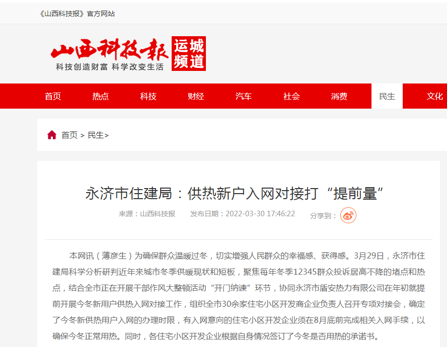PA直营:《山西科技报》点赞盾安永济热力公司 助力供热新户入网对接打“提前量”