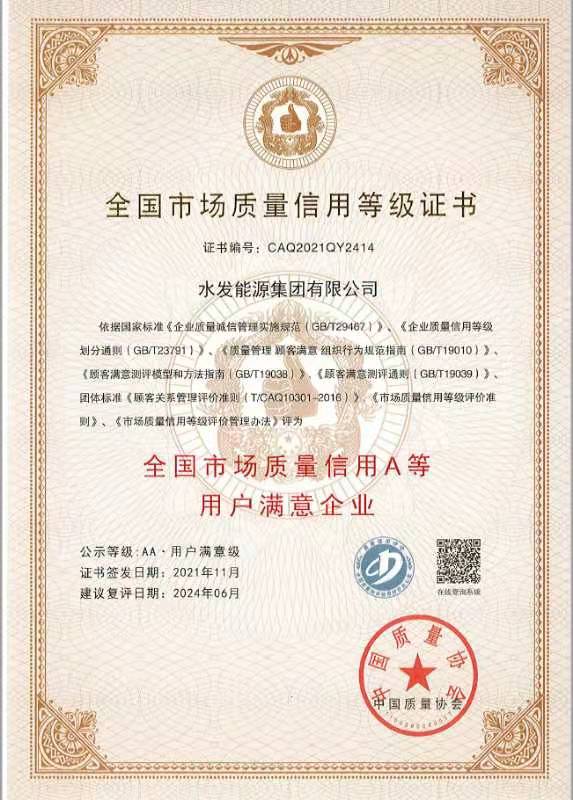 近日,中国质量协会发布2021年全国市场质量信用等级评价结果,水发能源集团获评“2021年全国市场质量信用A等(用户满意企业)AA级称号。